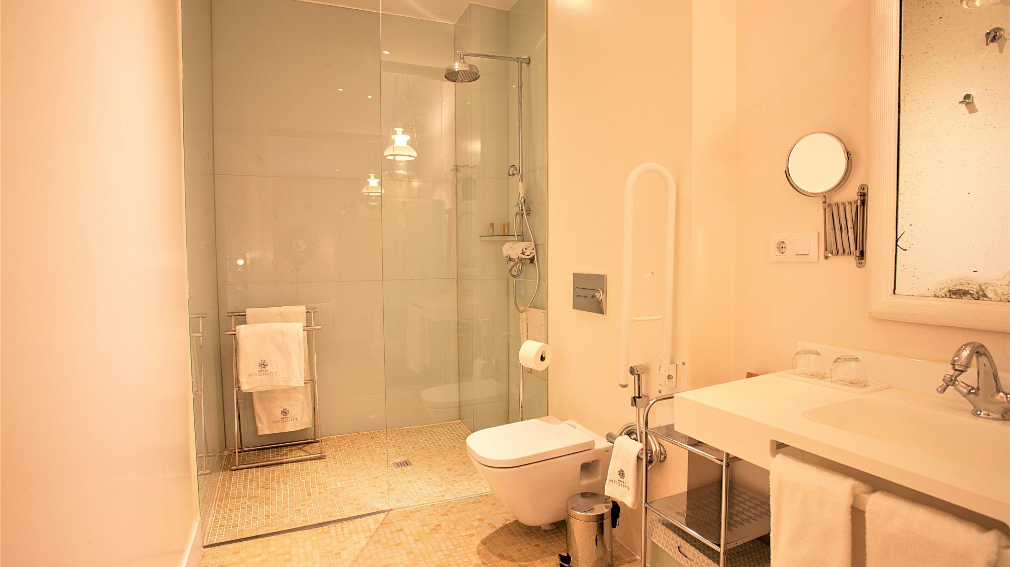 Doble. Our Albucasis room is named after the prestigious Andalusian doctor and scientist, born in the Umayyad Córdoba of the 10th century. Arranged in a single space of 21m2, the bedroom and living room rest on original hydraulic floors from the 19th century in a continuum that leads to the bathroom. bathroom with rain shower, only separated by glass walls.