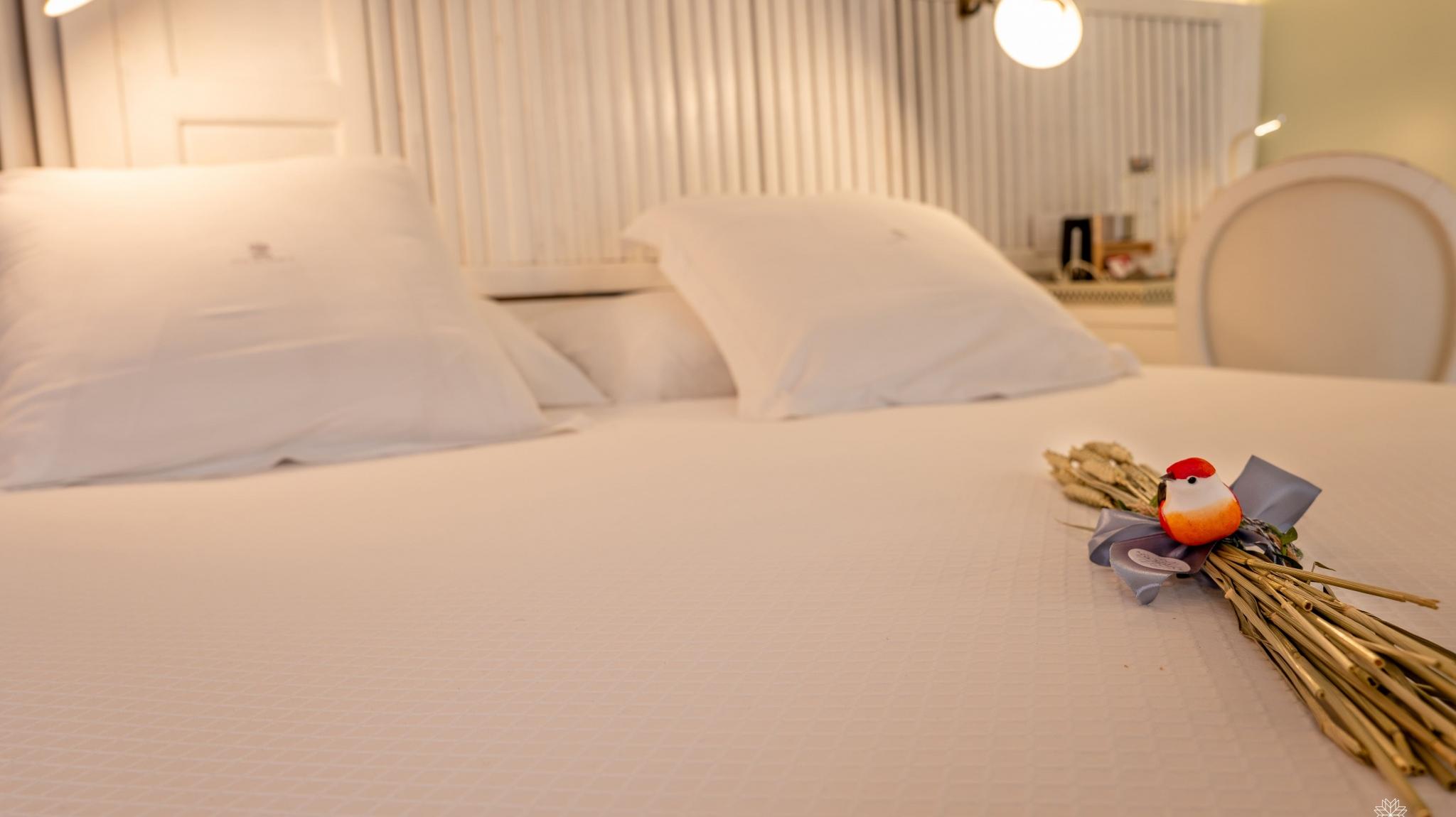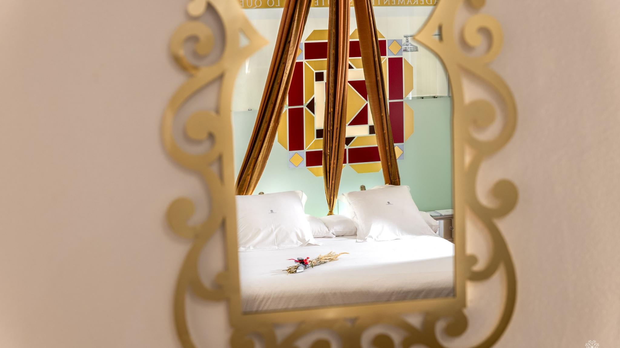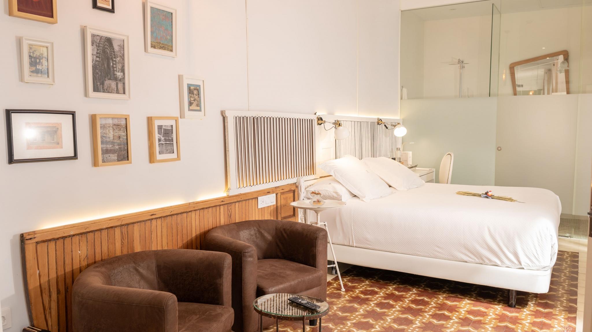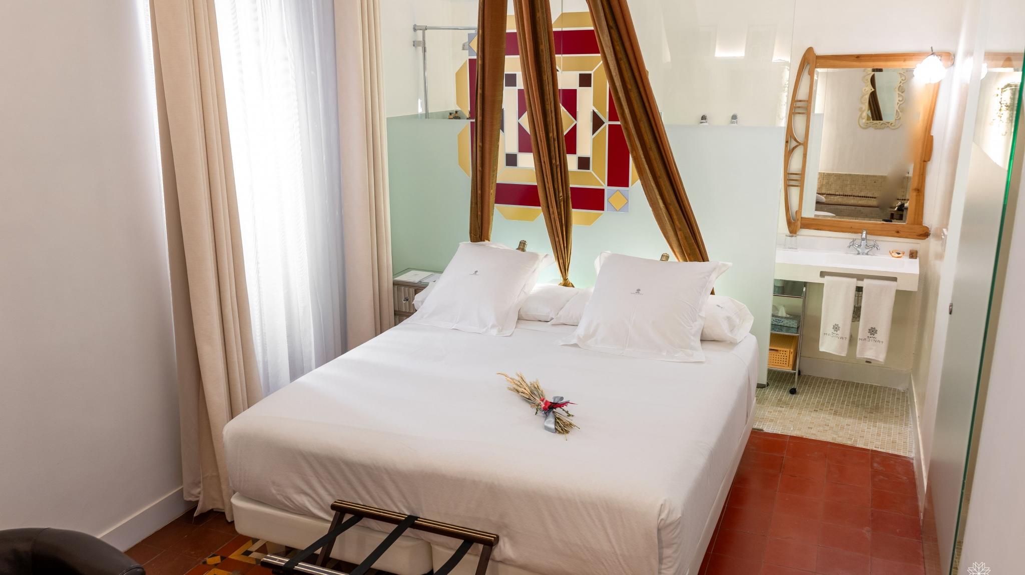 Doble Deluxe. Our Alcoba room gets its name from the Arabic al-qubba (domed room where valuable objects were kept) due to the canopy with which the bed is covered. It is located on the ground floor, with its entrance through the main courtyard and with two large windows that overlook the Calleja de los Arquillos, where an episode of the Cantar de Gesta de los Infantes de Lara took place. In it, the ornamental moldings and the colorful hydraulic floors, all original from the 19th century, have been restored. Arranged in a single space of 23 m2, it offers a bedroom and a living area with a bathtub in the same environment, as well as a spacious and comfortable bathroom with glass walls, with a rain-effect shower.