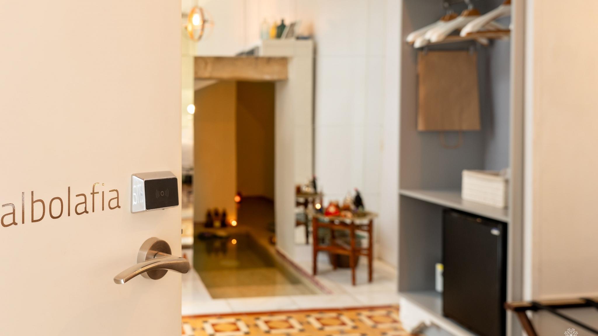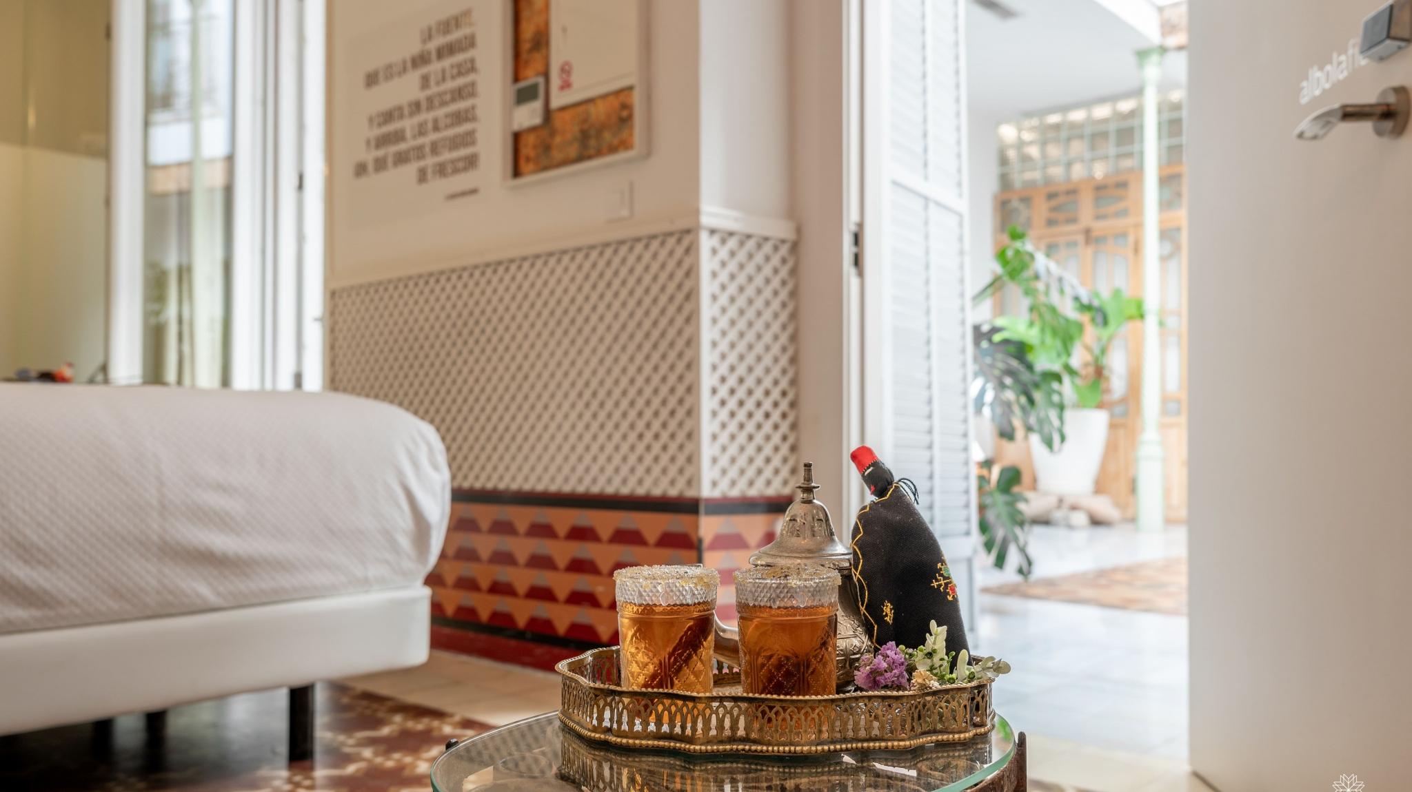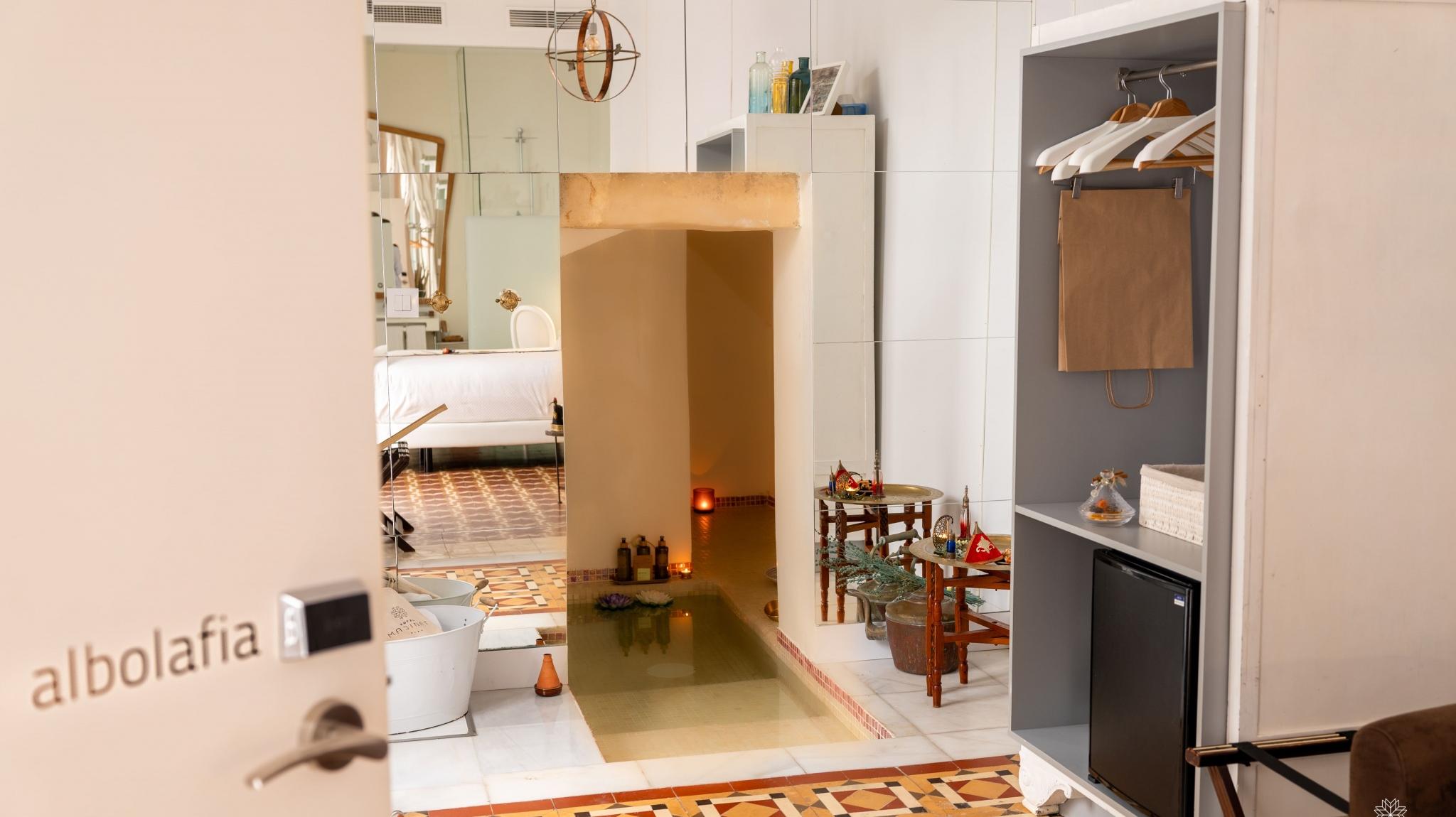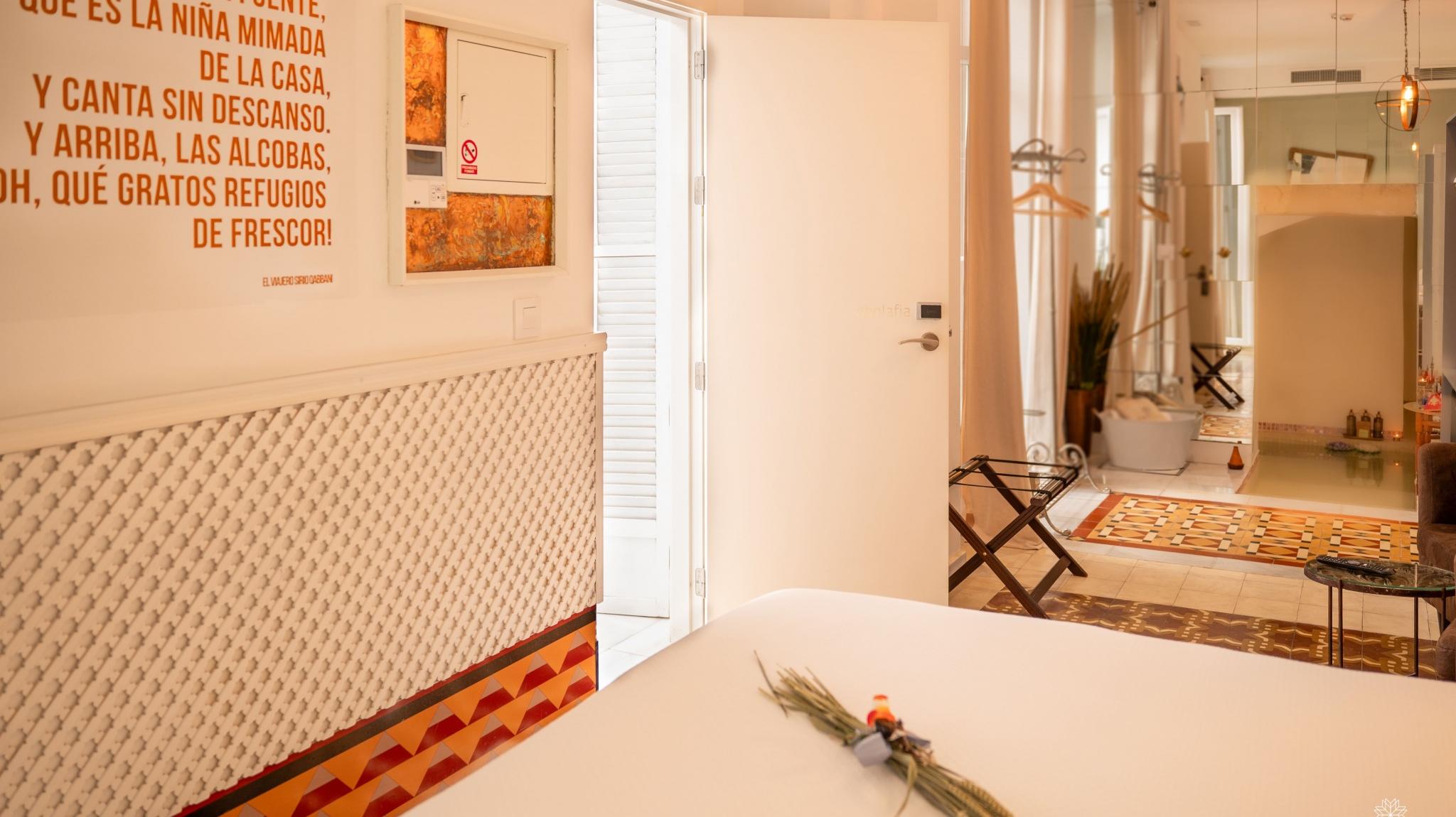 Doble Deluxe. Our Albolafia room gets its name from the mill equipped with a large waterwheel located on the banks of the Guadalquivir, next to the Roman bridge of Córdoba. Located on the ground floor, it has a large window overlooking the majestic central patio, with views of the Arab-Andalusian well. Arranged in a single space of 27 m2, it preserves the original hydraulic floor from the 19th century and has an Arab bathtub or hammam at one end of the room, and at the other, a comfortable bathroom with glass walls, with a rain shower.