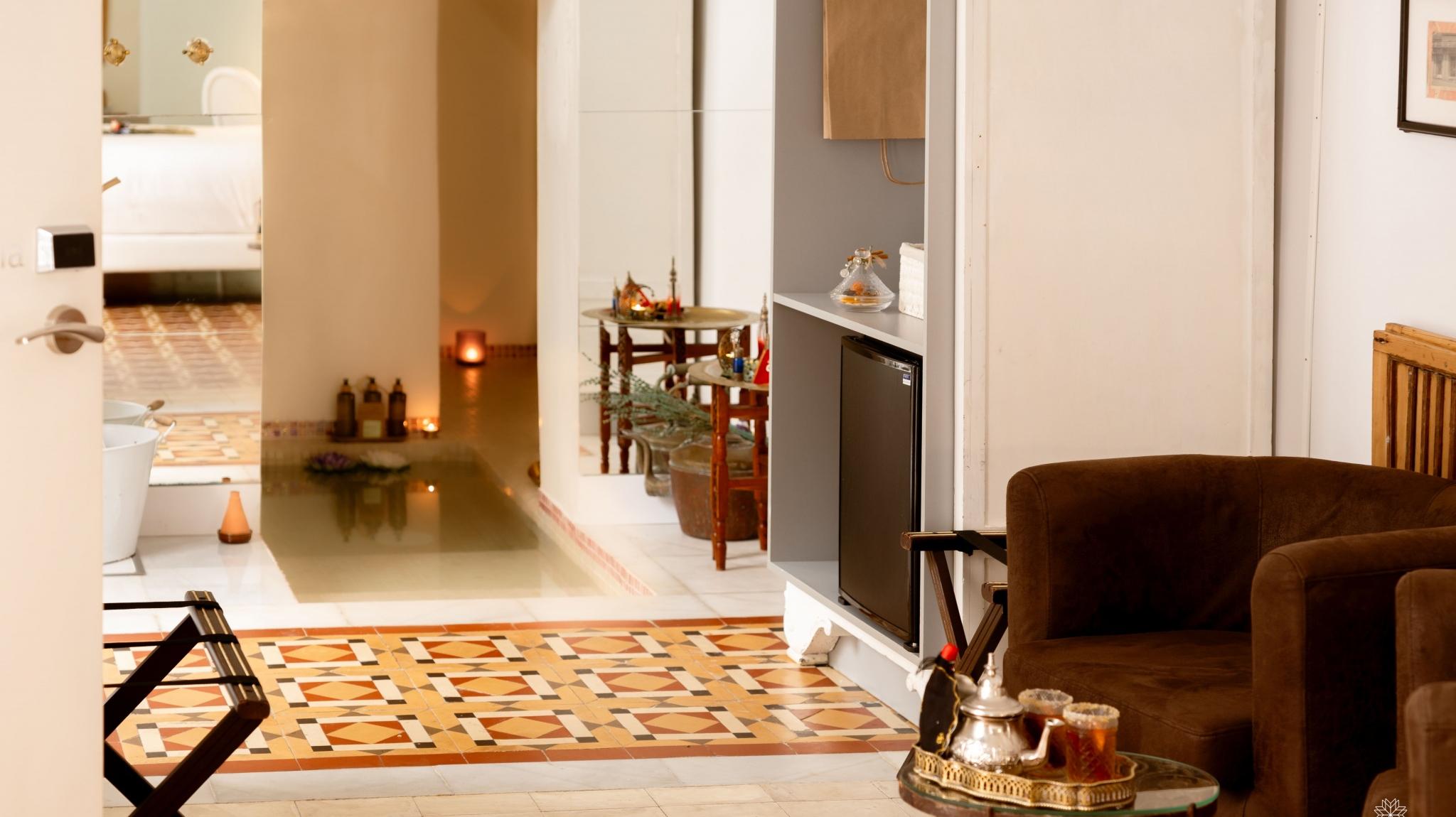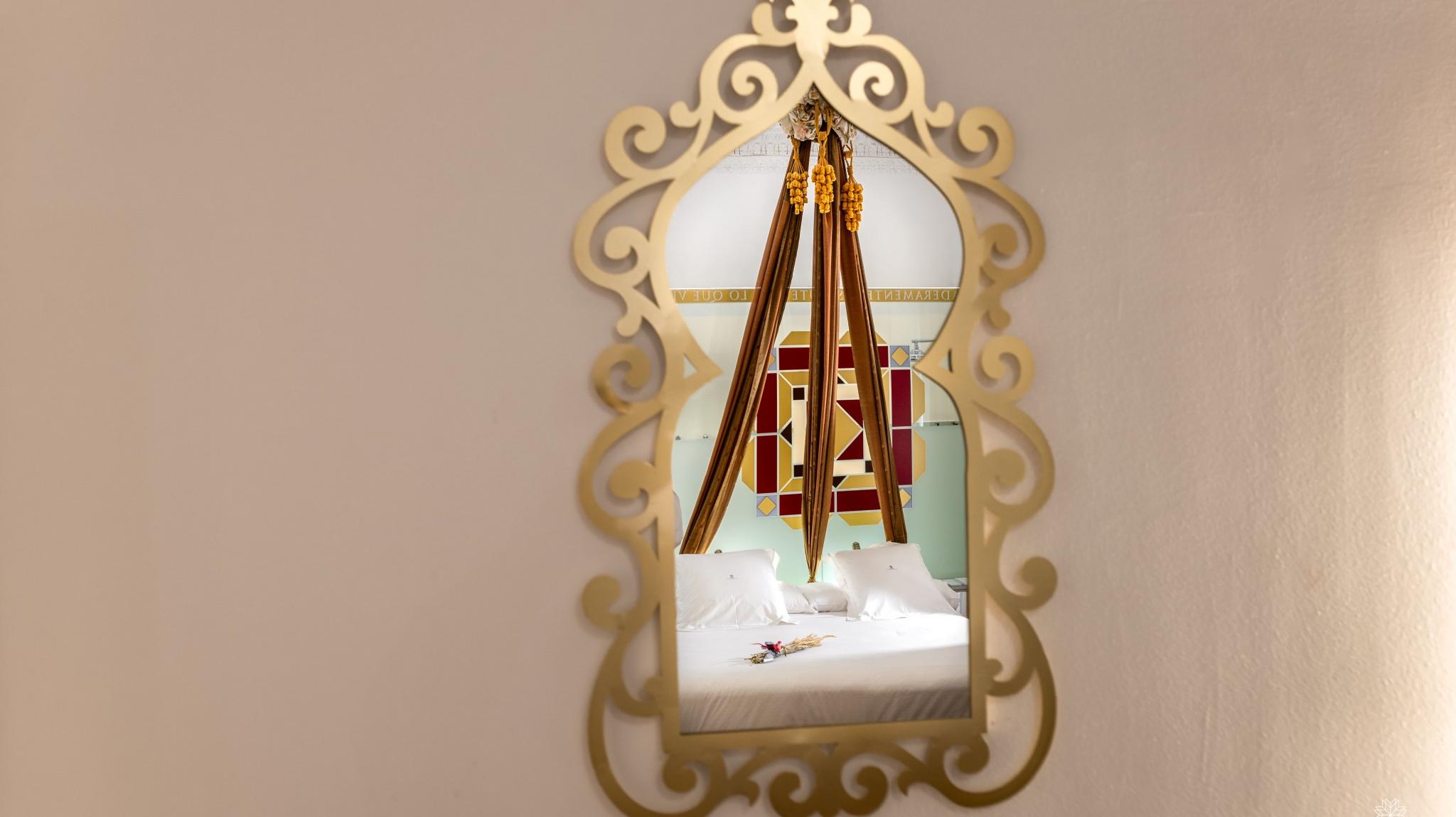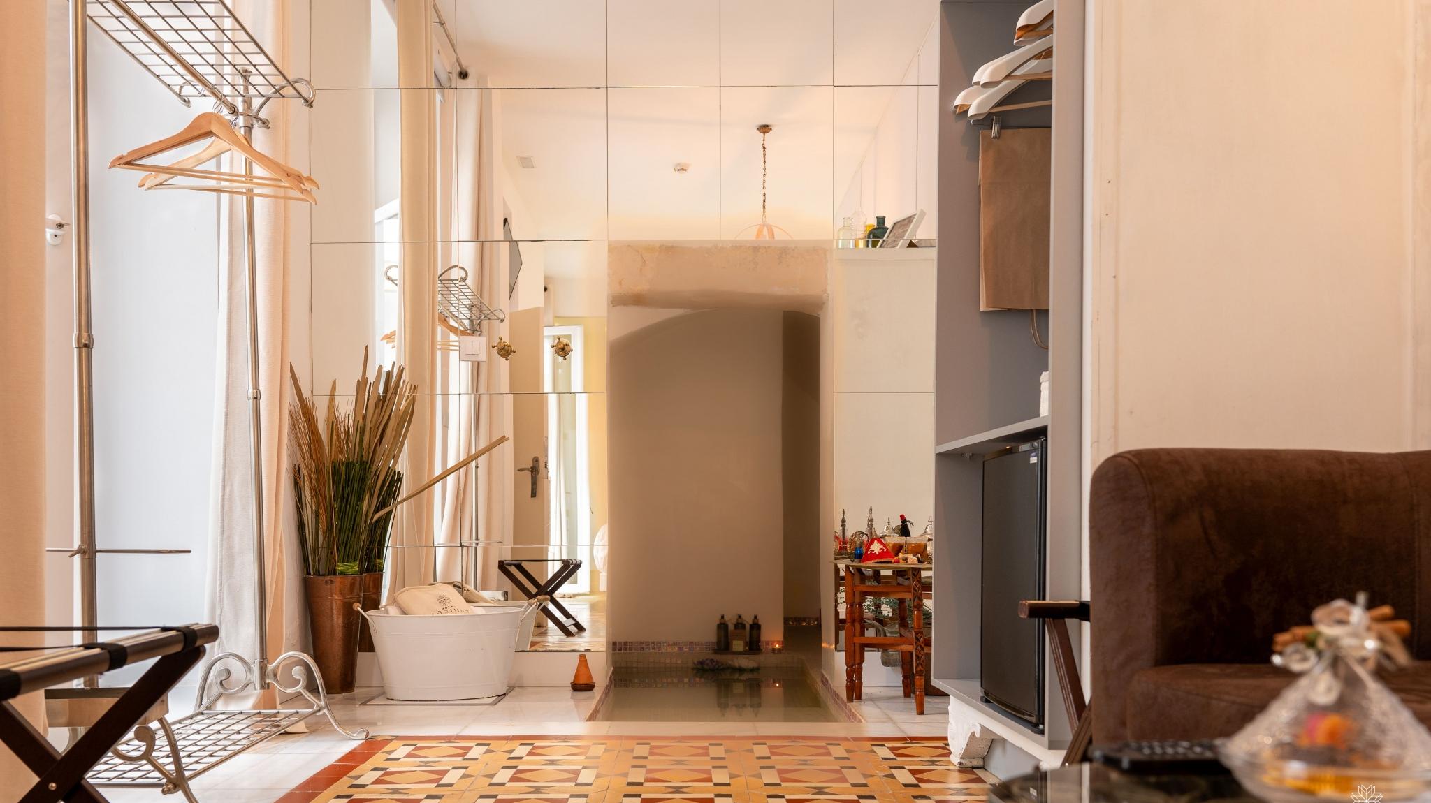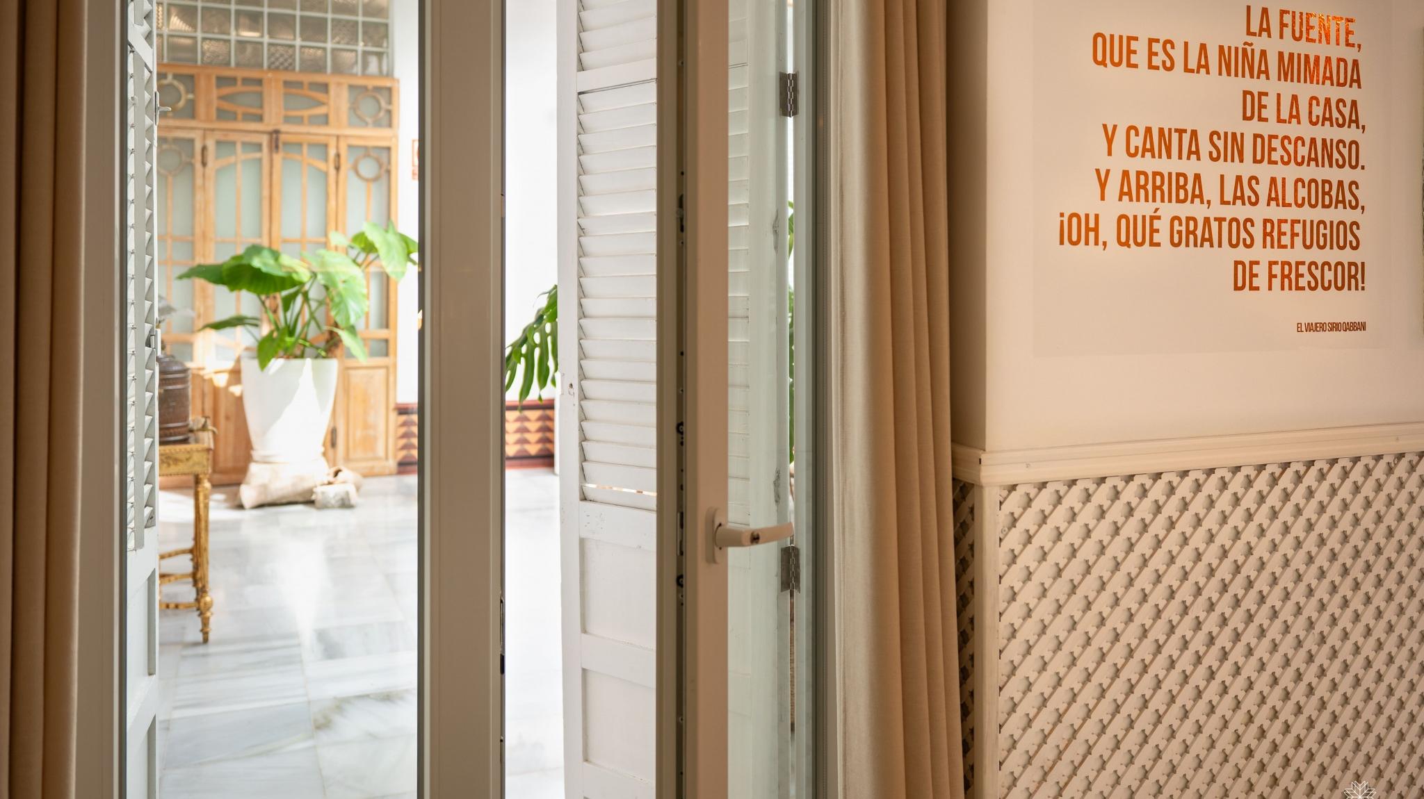 Doble Deluxe. Our Albolafia room gets its name from the mill equipped with a large waterwheel located on the banks of the Guadalquivir, next to the Roman bridge of Córdoba. Located on the ground floor, it has a large window overlooking the majestic central patio, with views of the Arab-Andalusian well. Arranged in a single space of 27 m2, it preserves the original hydraulic floor from the 19th century and has an Arab bathtub or hammam at one end of the room, and at the other, a comfortable bathroom with glass walls, with a rain shower.