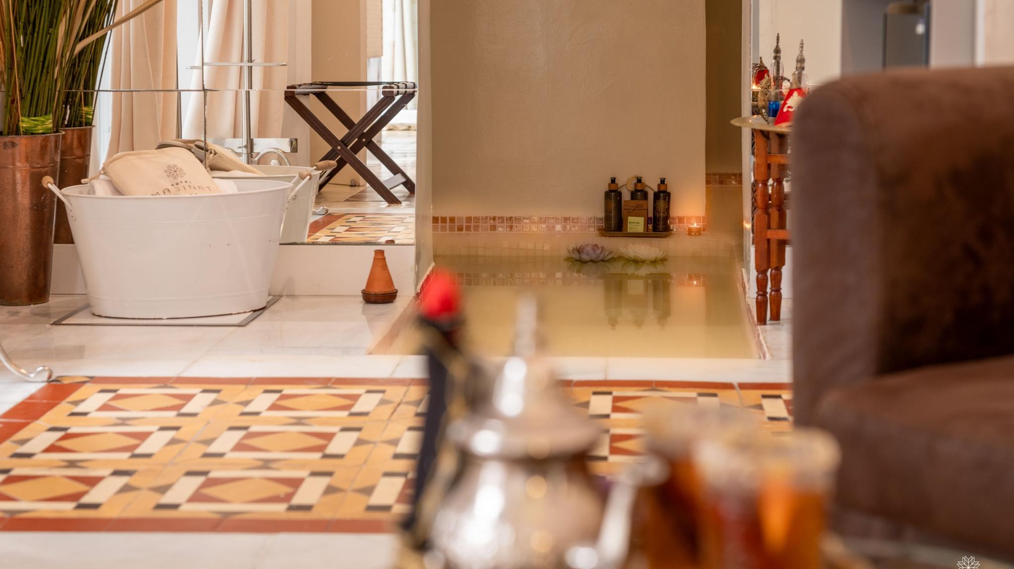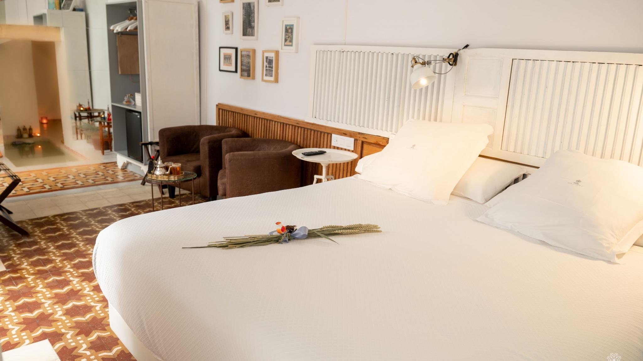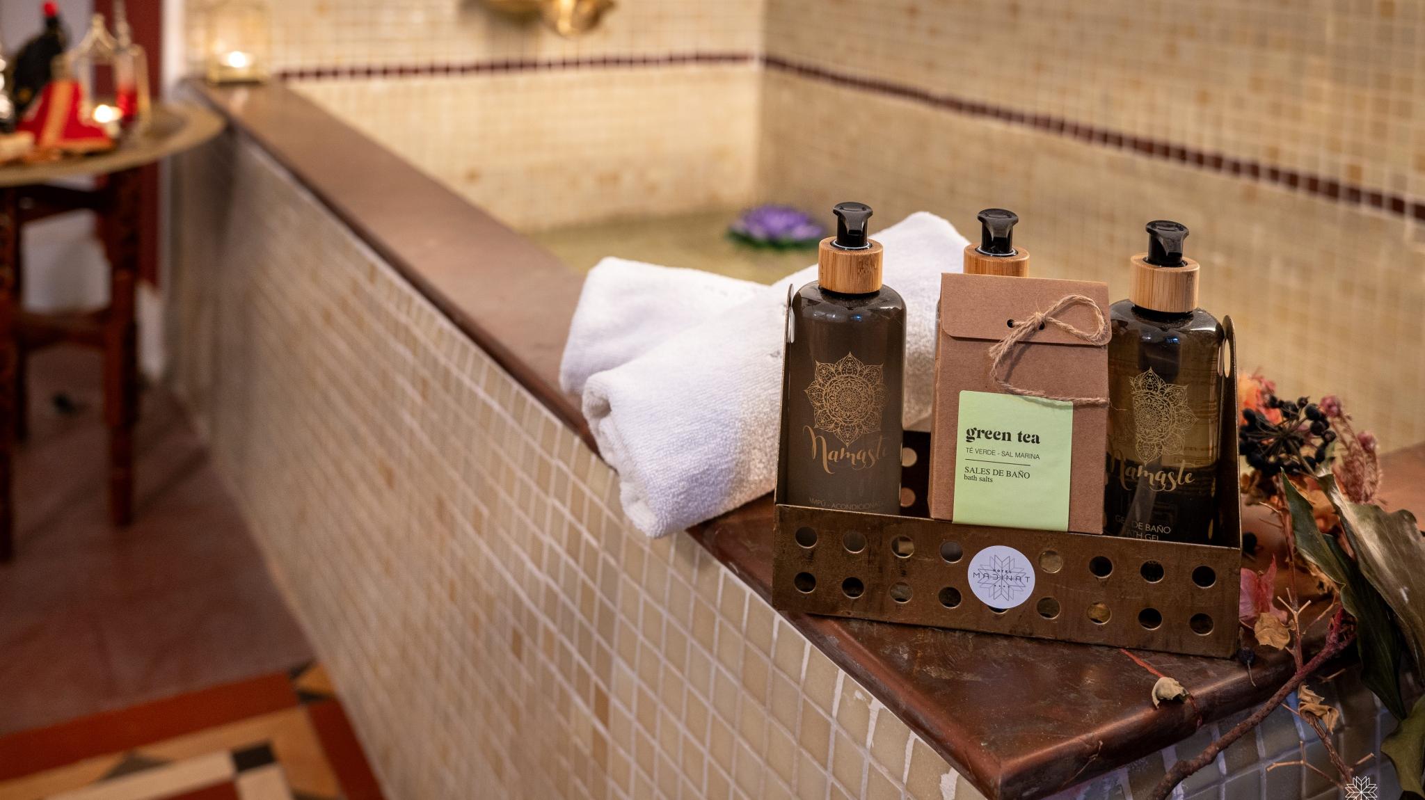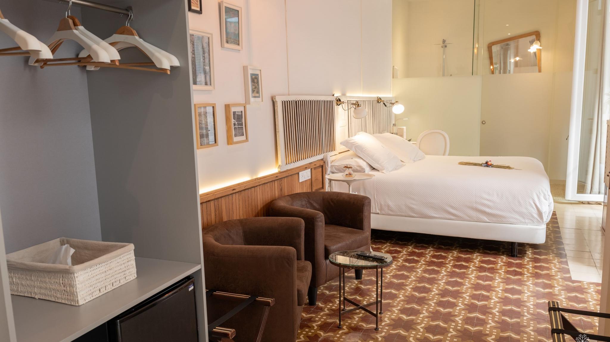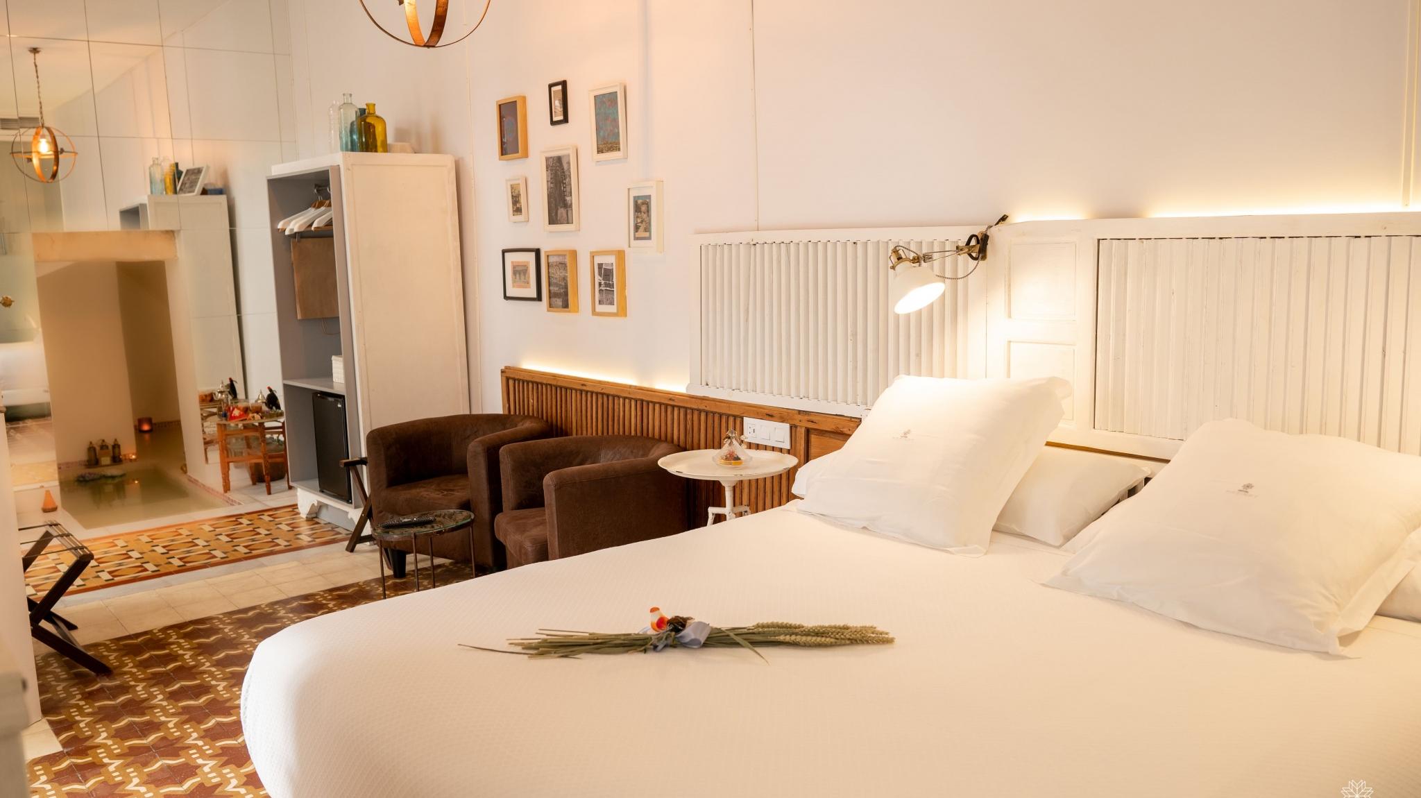 Doble Deluxe. Our Albolafia room gets its name from the mill equipped with a large waterwheel located on the banks of the Guadalquivir, next to the Roman bridge of Córdoba. Located on the ground floor, it has a large window overlooking the majestic central patio, with views of the Arab-Andalusian well. Arranged in a single space of 27 m2, it preserves the original hydraulic floor from the 19th century and has an Arab bathtub or hammam at one end of the room, and at the other, a comfortable bathroom with glass walls, with a rain shower.