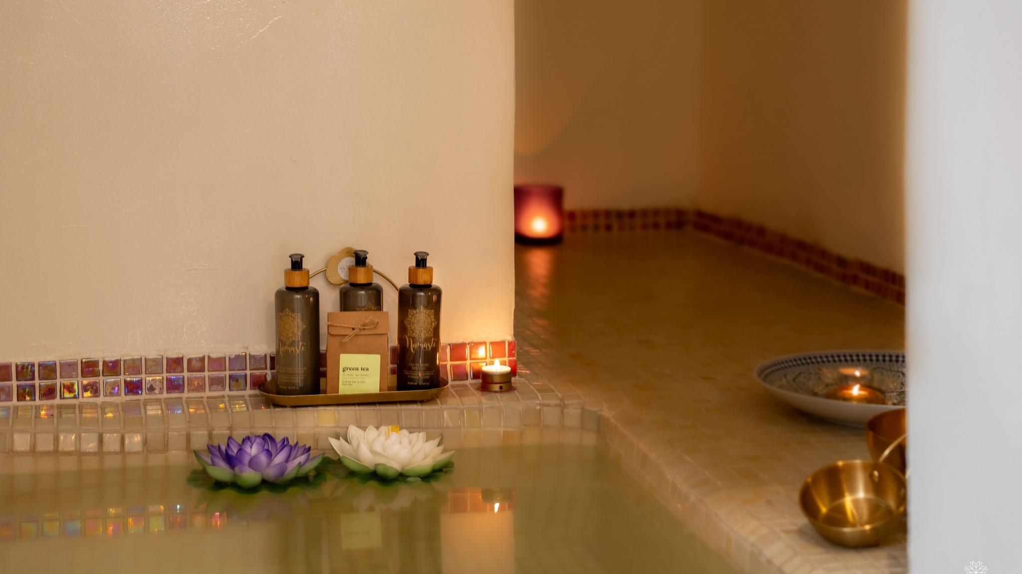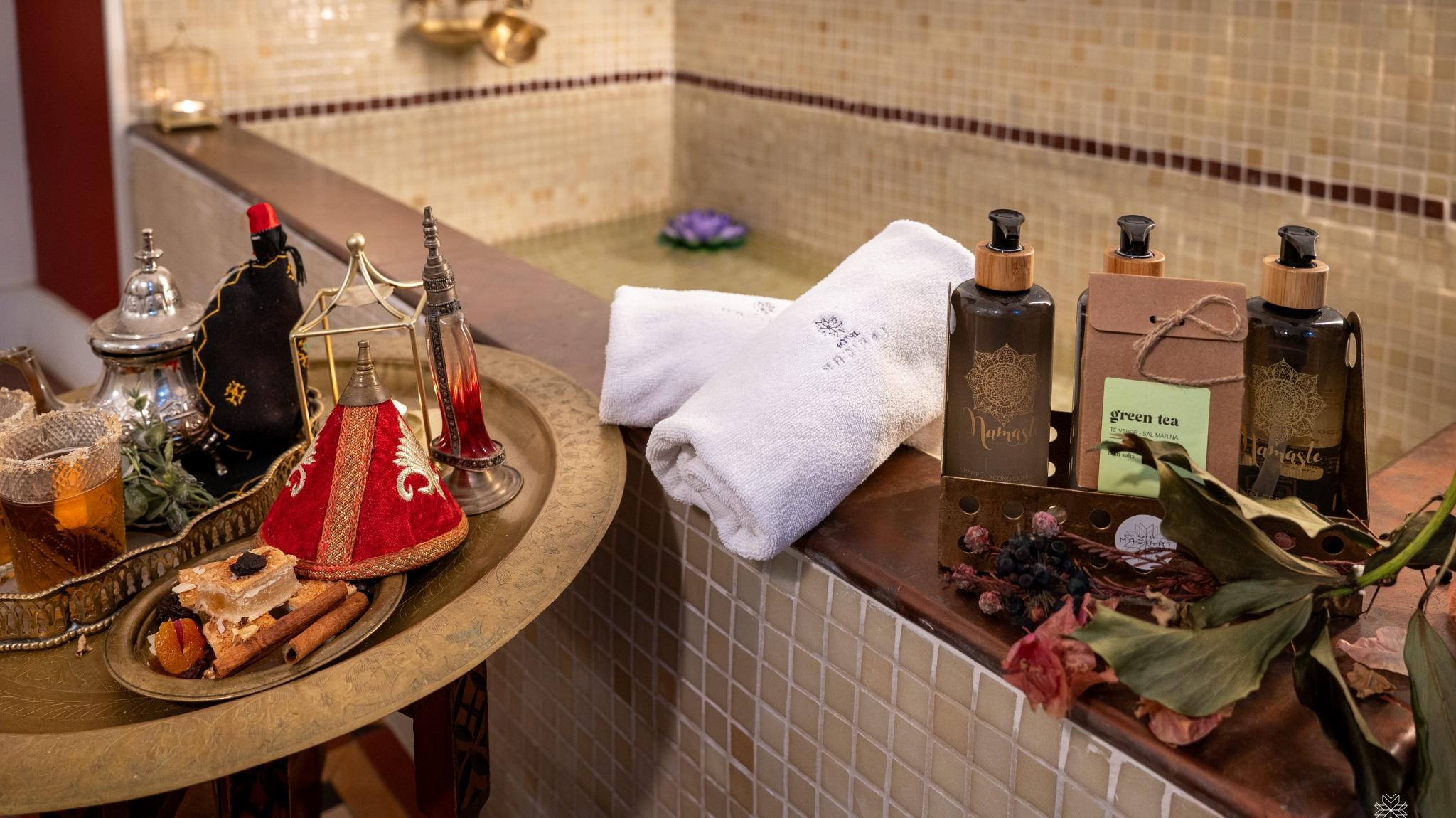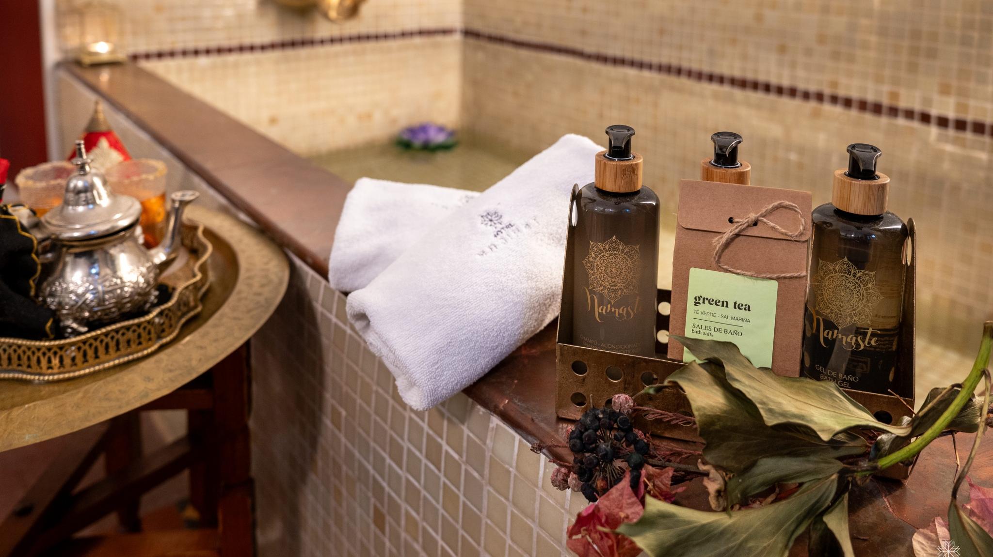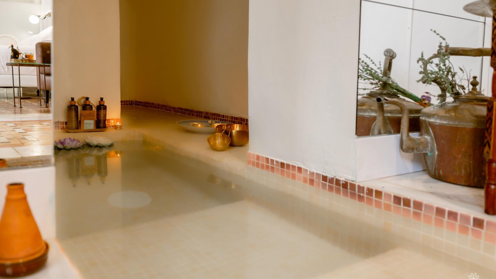 Doble Deluxe. Our Albolafia room gets its name from the mill equipped with a large waterwheel located on the banks of the Guadalquivir, next to the Roman bridge of Córdoba. Located on the ground floor, it has a large window overlooking the majestic central patio, with views of the Arab-Andalusian well. Arranged in a single space of 27 m2, it preserves the original hydraulic floor from the 19th century and has an Arab bathtub or hammam at one end of the room, and at the other, a comfortable bathroom with glass walls, with a rain shower.