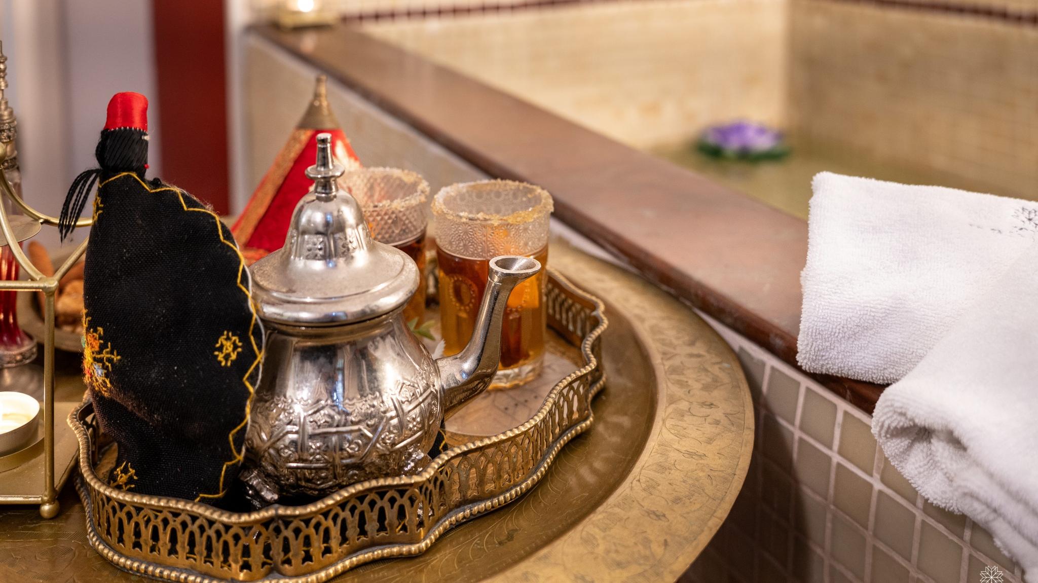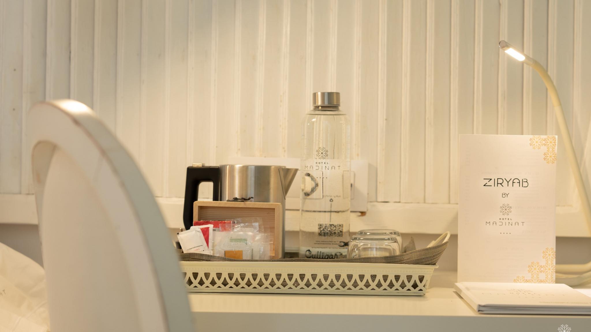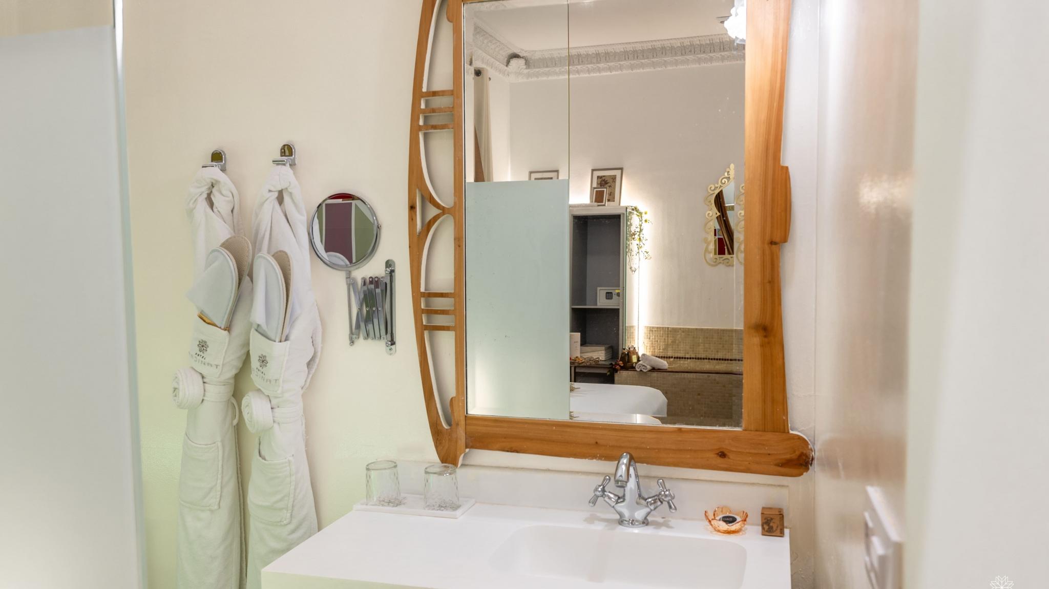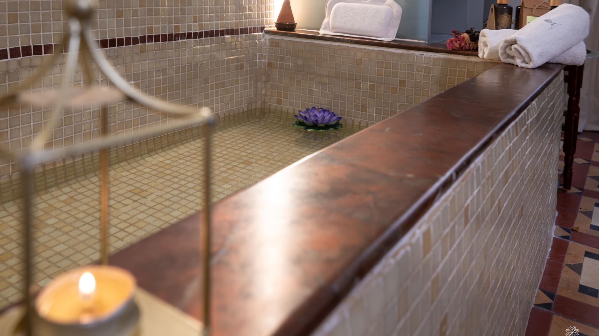 Doble Deluxe. Our Albolafia room gets its name from the mill equipped with a large waterwheel located on the banks of the Guadalquivir, next to the Roman bridge of Córdoba. Located on the ground floor, it has a large window overlooking the majestic central patio, with views of the Arab-Andalusian well. Arranged in a single space of 27 m2, it preserves the original hydraulic floor from the 19th century and has an Arab bathtub or hammam at one end of the room, and at the other, a comfortable bathroom with glass walls, with a rain shower.