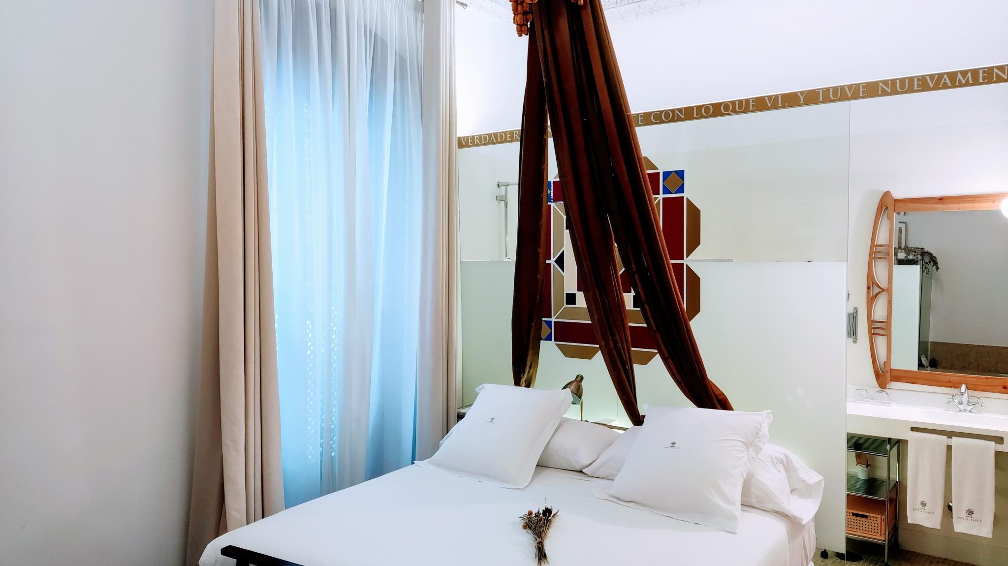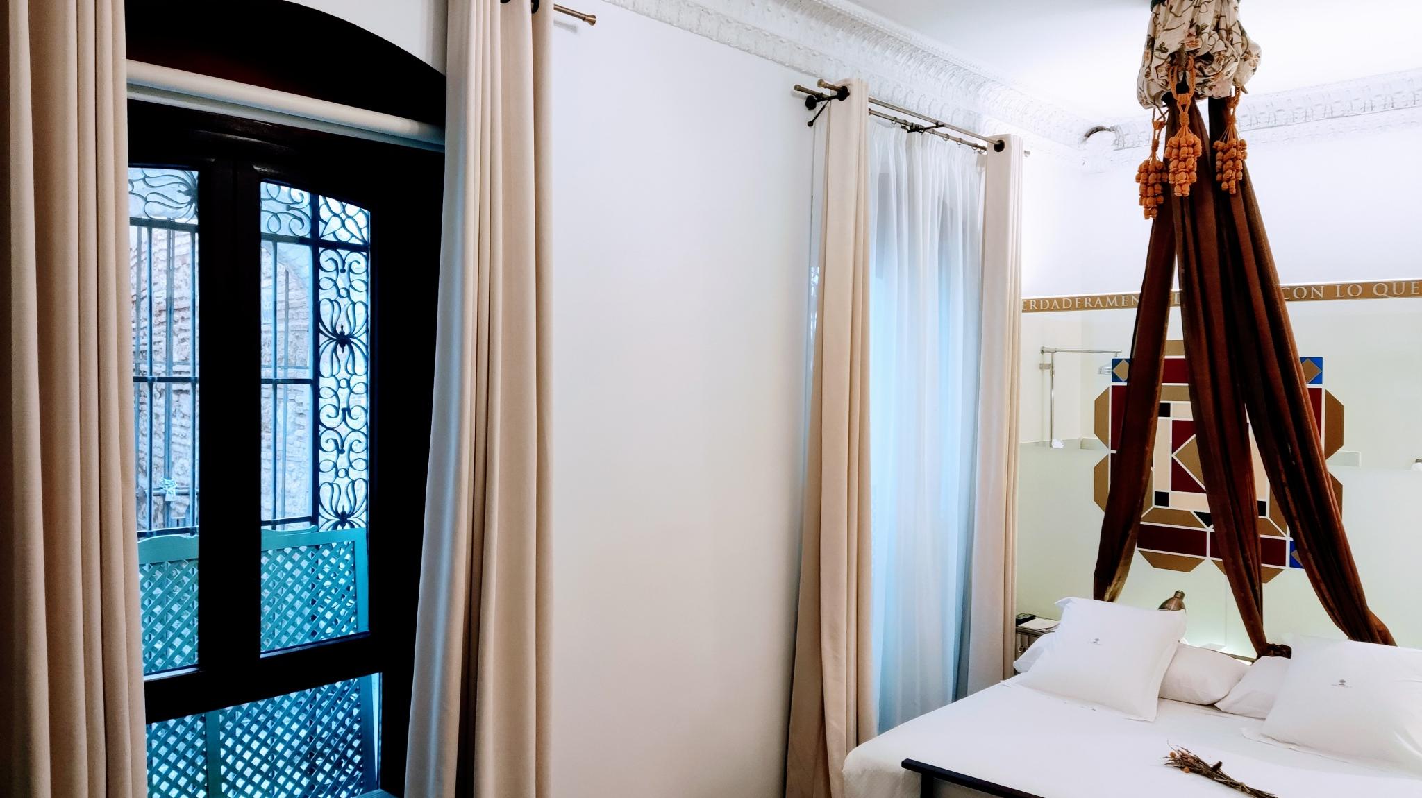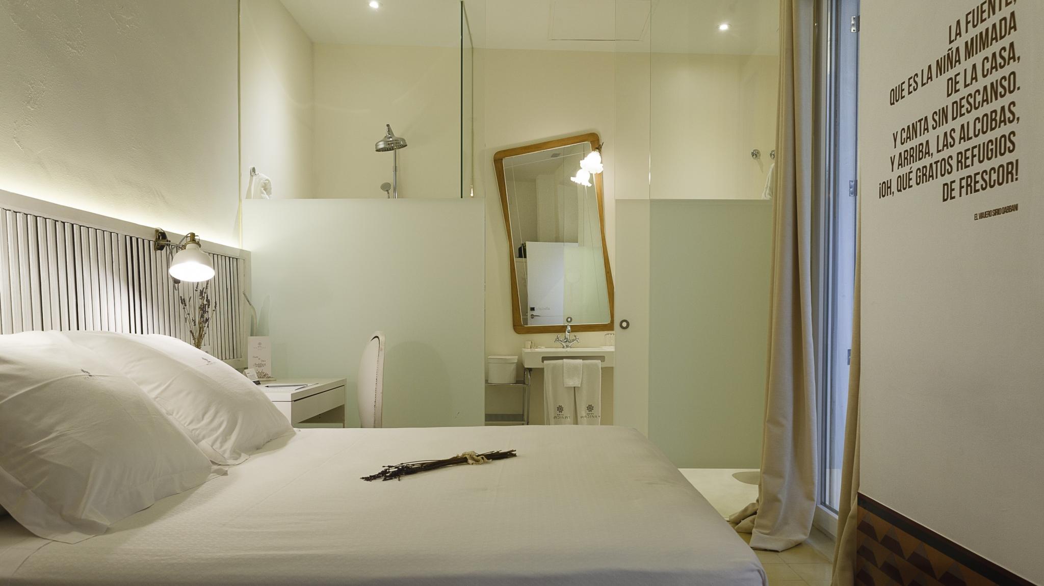 Doble Deluxe. Notre chambre Albolafia tire son nom du moulin équipé d'une grande roue hydraulique situé sur les rives du Guadalquivir, à côté du pont romain de Cordoue. Située au rez-de-chaussée, elle dispose d'une grande fenêtre donnant sur le majestueux patio central, avec vue sur le puits arabo-andalou. Aménagé en un seul espace de 27 m2, il conserve le sol hydraulique d'origine du XIXe siècle et dispose d'une baignoire arabe ou hammam à une extrémité de la pièce, et à l'autre, d'une salle de bain confortable aux parois vitrées, avec douche à effet pluie.