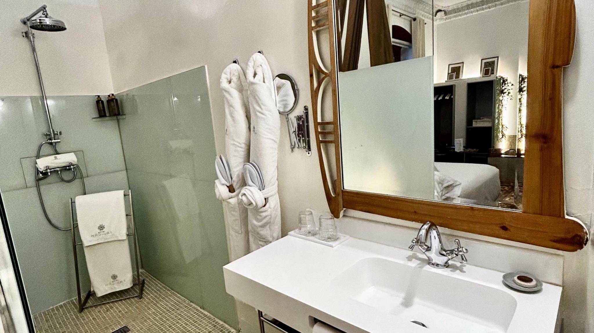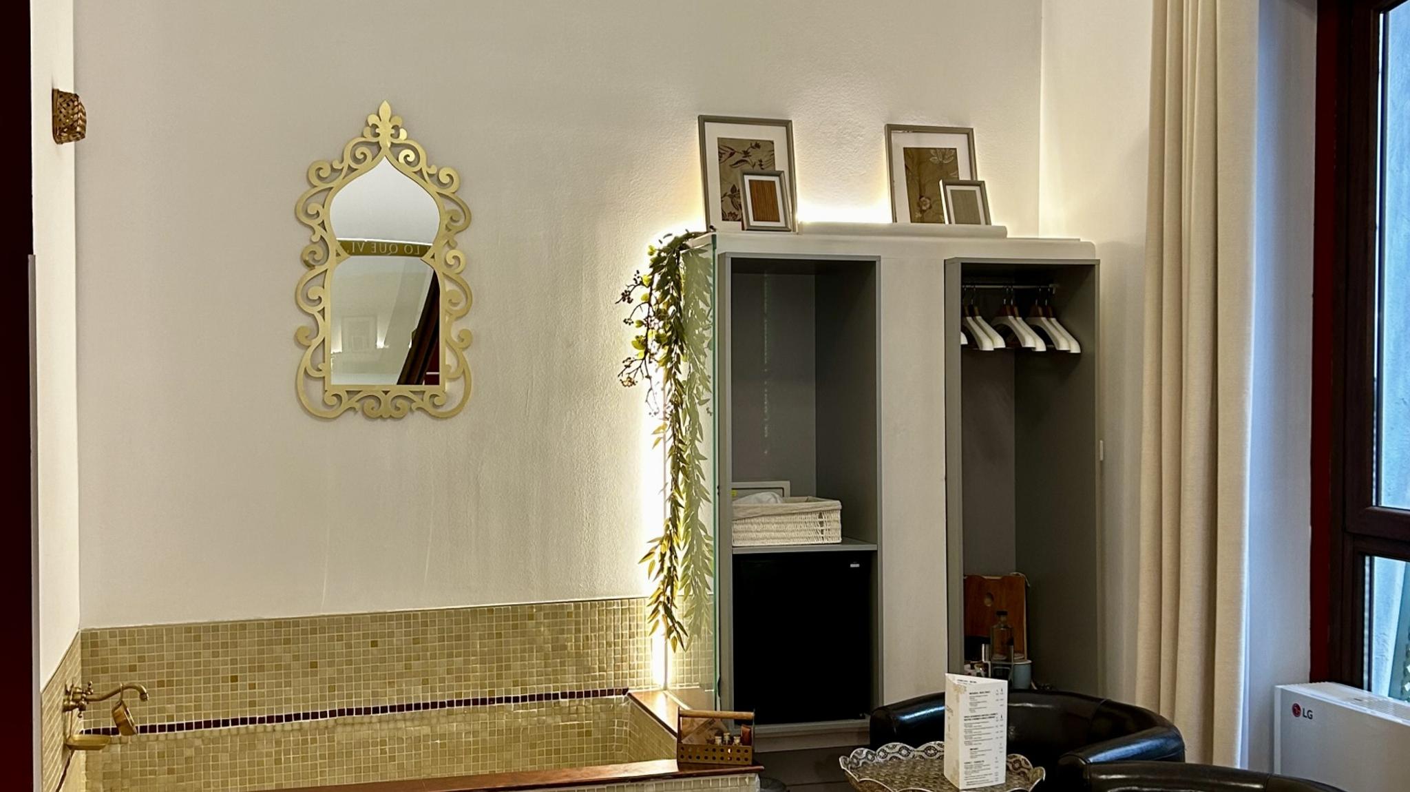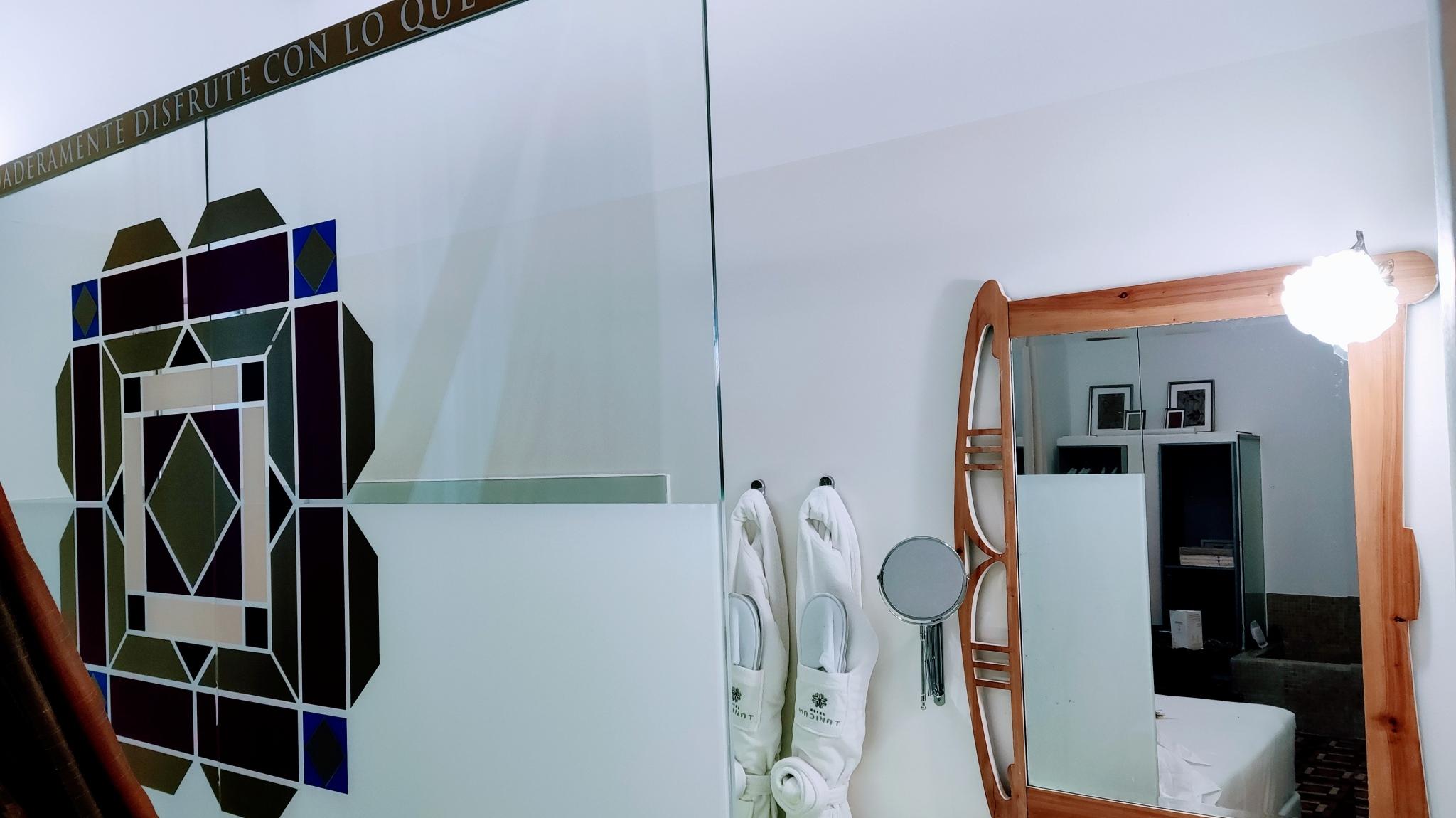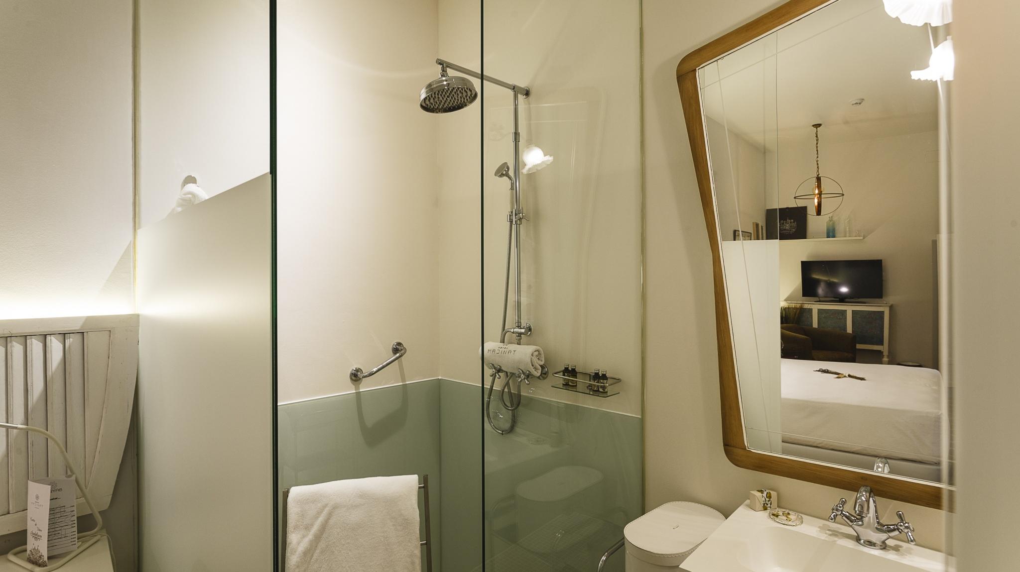 Doble Deluxe. Notre chambre Albolafia tire son nom du moulin équipé d'une grande roue hydraulique situé sur les rives du Guadalquivir, à côté du pont romain de Cordoue. Située au rez-de-chaussée, elle dispose d'une grande fenêtre donnant sur le majestueux patio central, avec vue sur le puits arabo-andalou. Aménagé en un seul espace de 27 m2, il conserve le sol hydraulique d'origine du XIXe siècle et dispose d'une baignoire arabe ou hammam à une extrémité de la pièce, et à l'autre, d'une salle de bain confortable aux parois vitrées, avec douche à effet pluie.